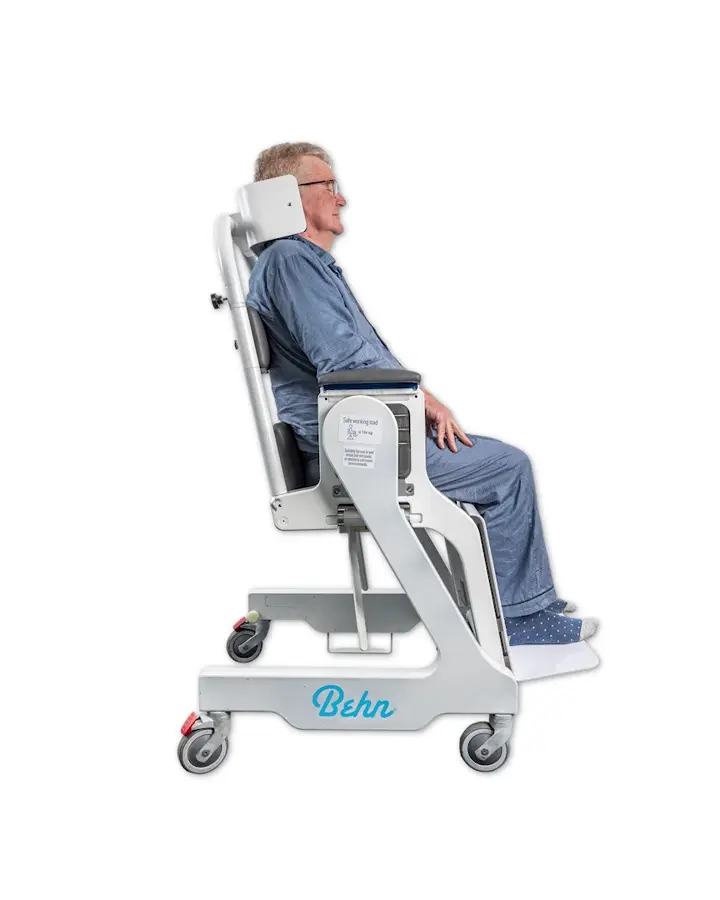 The Behn system keeps the person supported in the same hygiene chair from the bedroom into the bathroom and back again. Because the chair docks directly to the bed, there is no lifting, no hoisting and no transferring between surfaces. The individual stays securely positioned while carers move them through the full bathroom routine.